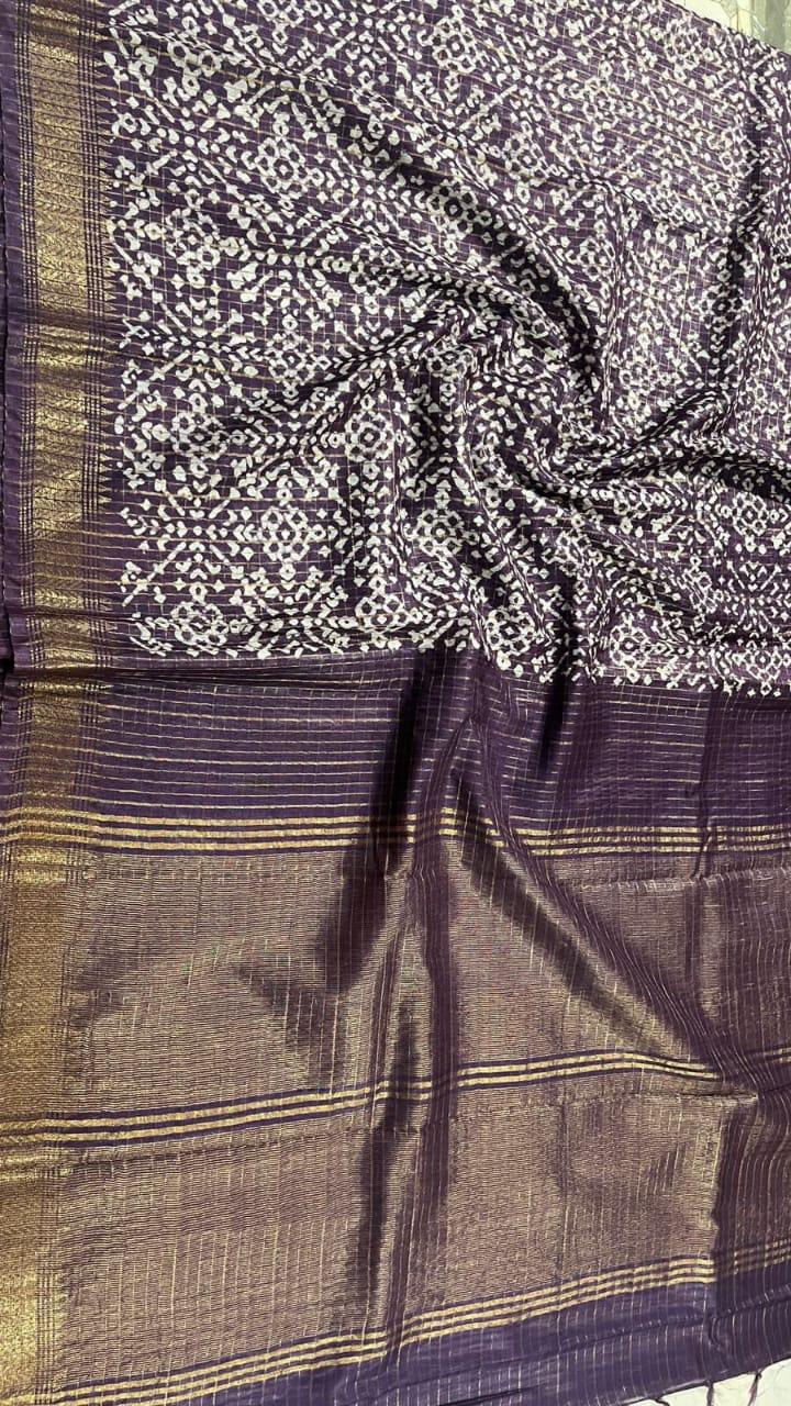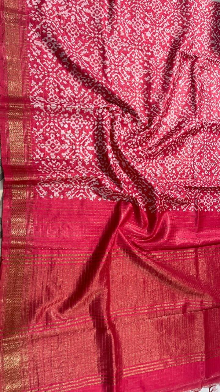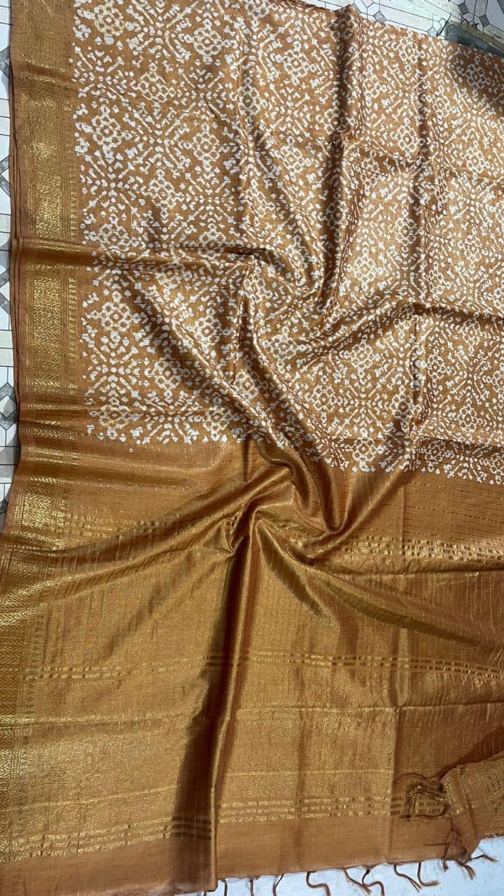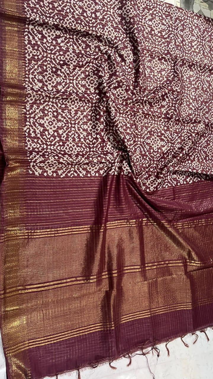 Our Wholesale Ajrak Batik Printed Mangalgiri Semi Silk Sarees offer a unique blend of tradition and style. Crafted from premium Mangalgiri cotton silk, these sarees are designed for versatility, making them perfect for festivals, weddings, parties, and casual outings.